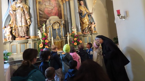 Dort wurden wir herzlich von Schwester Ruth Maria von den Liobaschwestern empfangen. Gemeinsam gingen wir leise in die Kirche, wo uns Schwester Ruth Maria spannende Einblicke in das Leben der heiligen Lioba gab. Anschließend hatten die Kinder die Möglichkeit , die Kirche in Ruhe zu erkunden. Ein besonderes Highlight war der Besuch der Krypta, in der die Reliquien der heiligen Lioba ruhen.