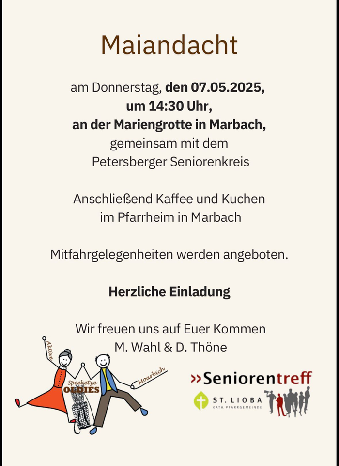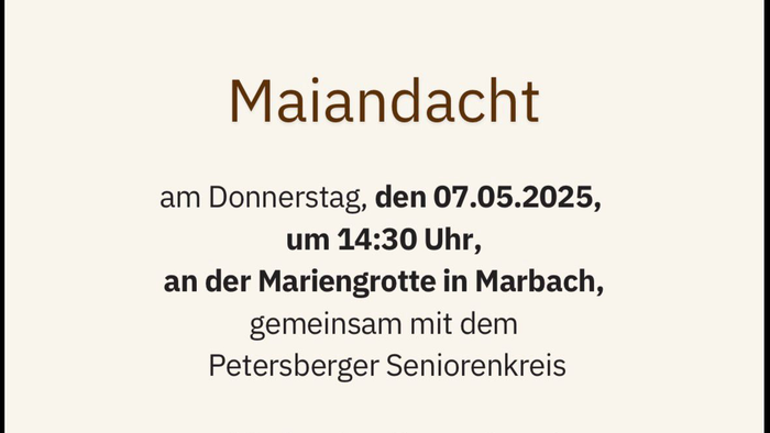 Maiandacht am 07.05.2026 an der Mariengrotte in Marbach, gemeinsam mit dem Seniorenkreis Petersberg. Anschließend Kaffee und Kuchen im Pfarrheim in Marbach