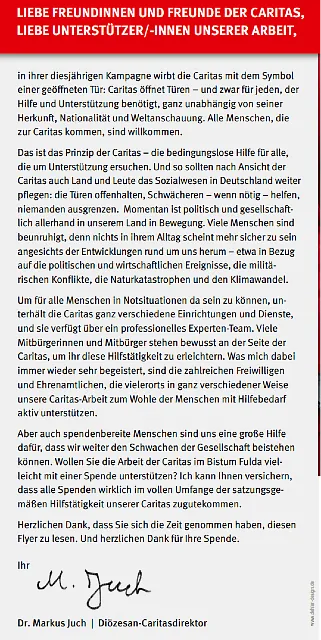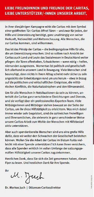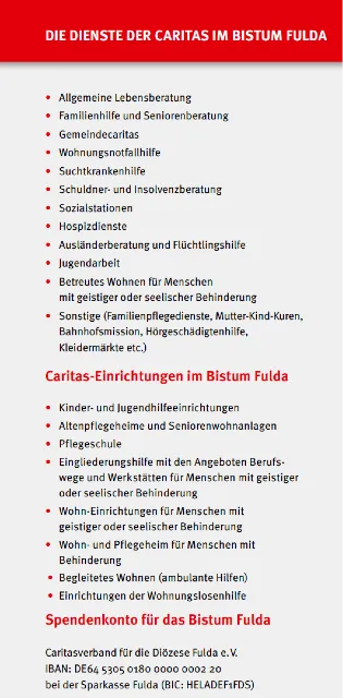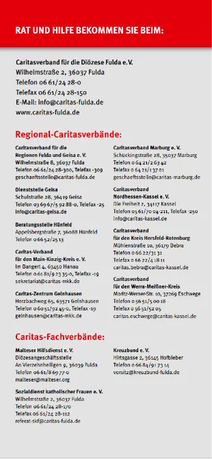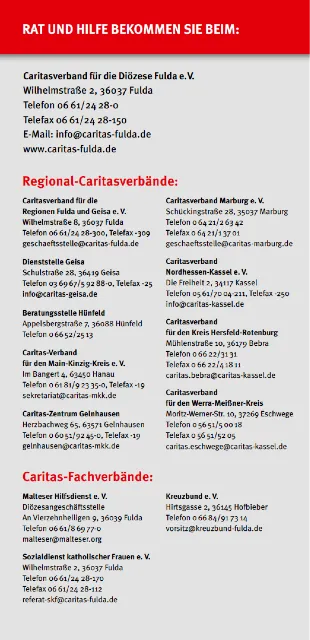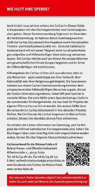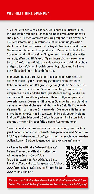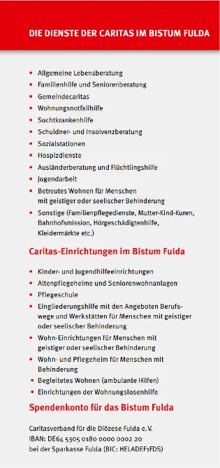 Die anderen 50 % Ihrer Spende gehen an die Caritas im Bistum Fulda – zur Förderung vielfältiger Hilfsangebote, z. B. in der Wohnungsnotfallhilfe, Familienberatung, Flüchtlingshilfe, Hospizarbeit und vielem mehr.