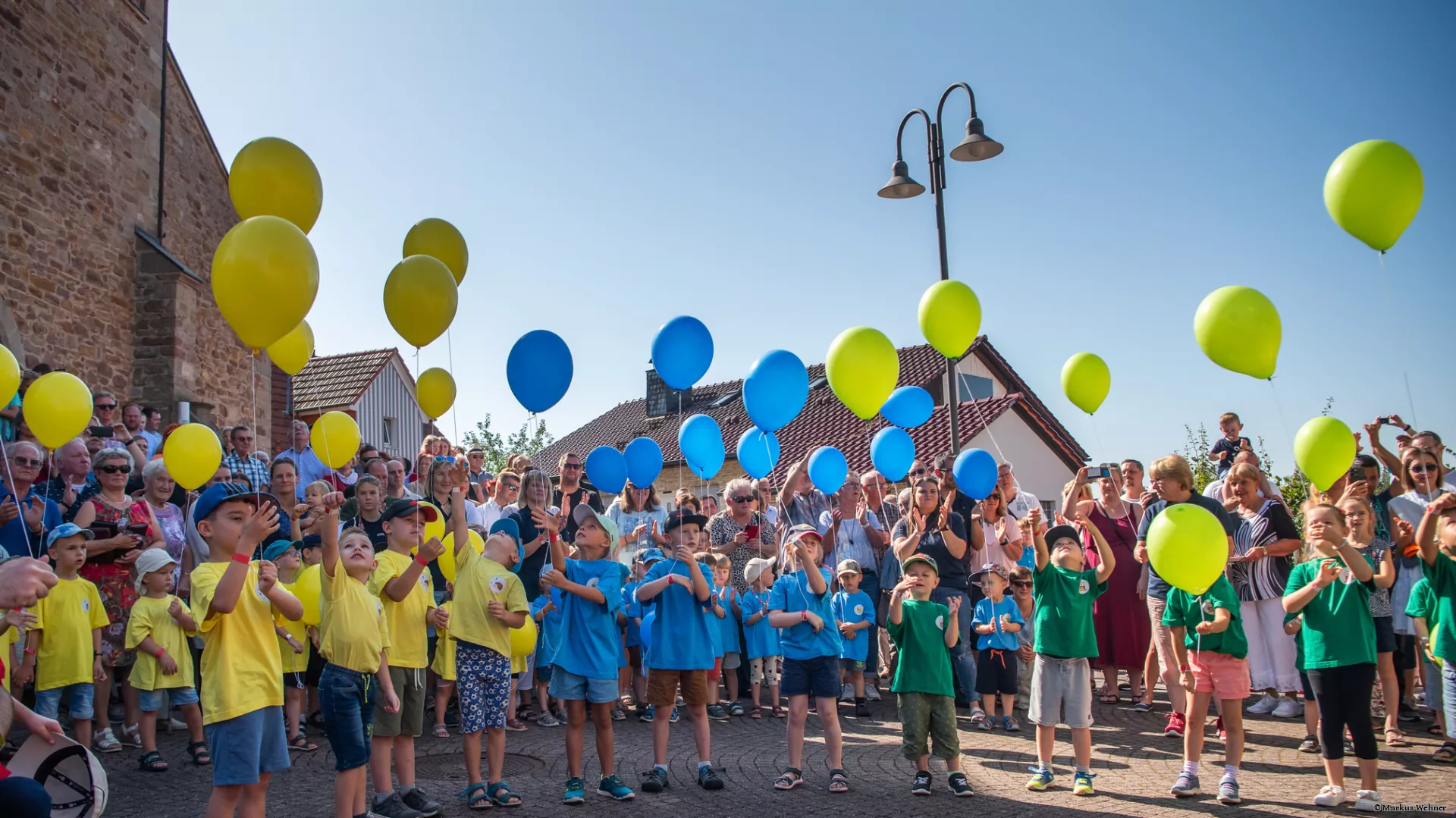 Mit passenden T-Shirts und einem mit Helium gefüllten Luftballon ergaben die Kinder ein wunderschönes, buntes Bild.