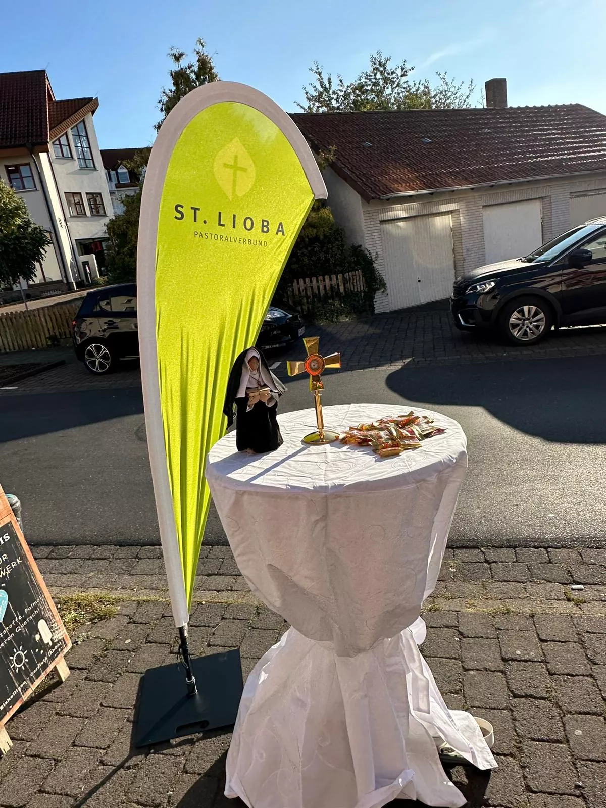 Um allen Gästen des Gottesdienstes und der Liobawoche die wertvolle religionspädagogische Arbeit der kath. KiTa St. Paulus zu präsentieren, hat sich das päd. Team für eine Stellwand in den Kirchen (Liobakirche & Rabanus-Maurus-Kirche) entschieden. Auf dieser wird ein Teil ihrer rel. päd. Arbeit dargestellt, der mit den Kindern - teils auch nicht katholischer Konfession erarbeitet wurde. Die Kinder und Erzieherinnen hatten große Freude an dem Thema der Hl. Lioba.