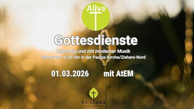 Seit 2020 ist der Alive-Gottesdienst der Gottesdienst mit moderner Musik und einer etwas anderen Atmosphäre, als man es von unseren klassischen Gottesdienst kennt. Eine Sonntagsmesse ohne Orgel und Gesangbuch. Die Messe wird von unterschiedlichen Gruppen und Bands der Pfarrei musikalisch begleitet. Mit Keyboard, Gitarre, Geige, Querflöte und Schlagzeug wird Musik gemacht. Lieder von Albert Frey, Outbreakband, Hillsong und anderen Gruppen aus dem Lobpreisgenre kommen zum Einsatz. Die Liedtexte sind auf einer große LED-Leinwand zu sehen. Nach dem Motto „lebendiger Gott, lebendiger Glaube = lebendiger Gottesdienst, lebendige Gemeinde“ wird ein Gottesdienst im wahrsten Sinne des Wortes gefeiert, bei dem kräftig mitgesungen, viel geklatscht und hin und wieder getanzt wird. Zu einer andächtigen Gebetsstimmung kommt es dann bei den Fürbitten, wenn die nicht von einem Lektor vorgelesen, sondern von allen Gemeindemitgliedern frei formuliert werden können oder im Anschluss an den Gottesdienst die Möglichkeit genutzt wird, für sich beten oder sich einzeln segnen zu lassen.